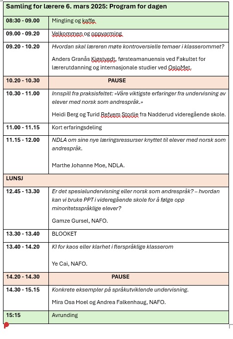 NAFO inviterer til samling for lærere som underviser elever med norsk som andrespråk i videregående opplæring. Med andre ord er samlingen både for lærere som underviser ordinære klasser, og for lærere som underviser innføringsklasser, kombinasjonsklasser og ved egne minoritetsspråklige løp. Målet med samlingen er faglig påfyll samt muligheten for erfaringsdeling (se program under).