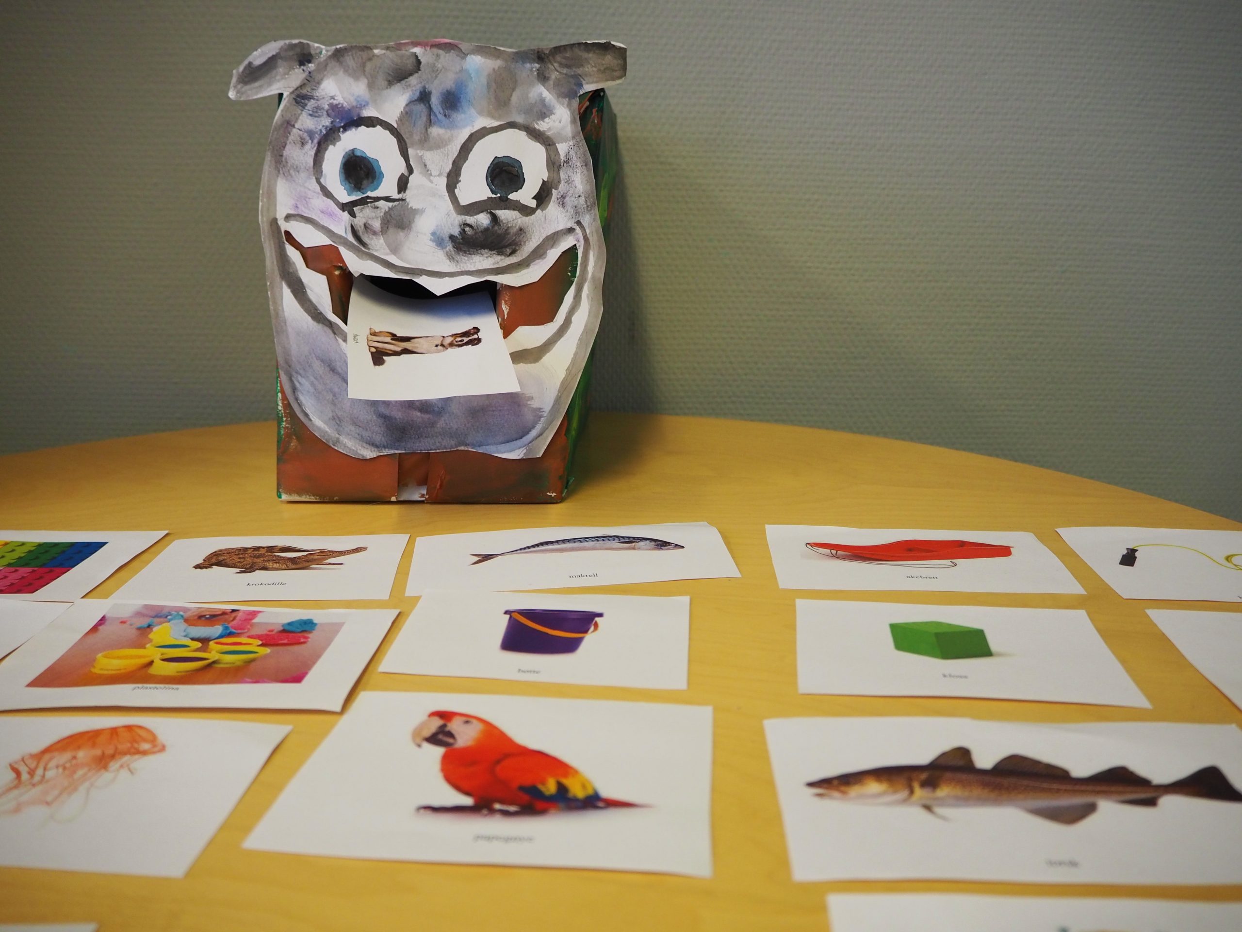 Til denne aktiviteten trenger man en pappeske eller lignende til å lage et monster med stor munn. Skriv ut bildekort. Ta gjerne barna med på å lage monsteret og finn temaer, undertemaer og ord som monsteret skal spise. Man kan for eksempel lage ulike oppgaver avhengig av et konkret formål, eller bare leke med ulike ord og begreper.