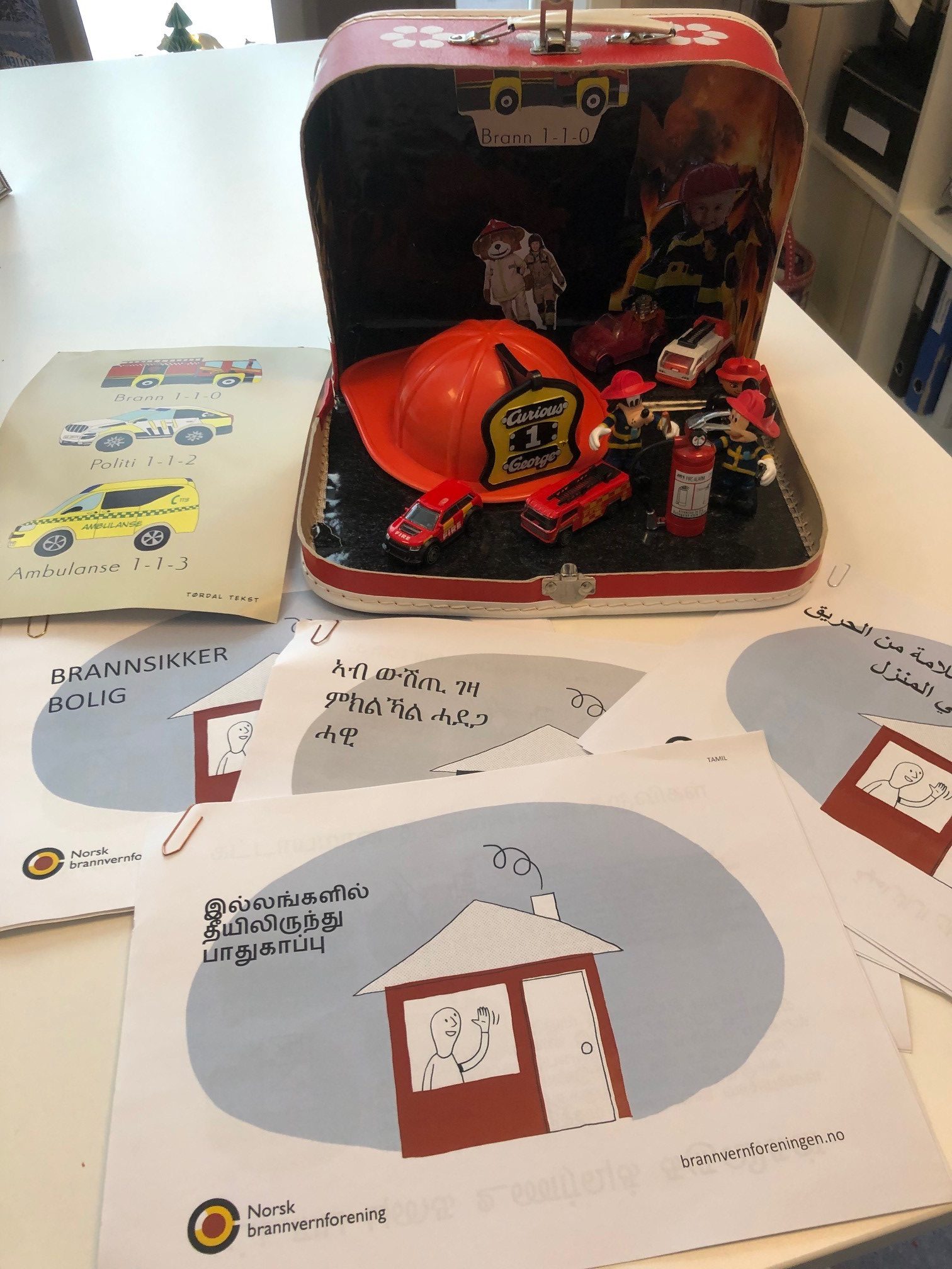 Barnehagen har laget en koffert med tema brannvern. Brosjyrene som ligger foran kofferten, finnes på mange språk, og er utviklet av Norsk brannvernforening. De finnes på morsmål.no: Brannvern på mange språk
