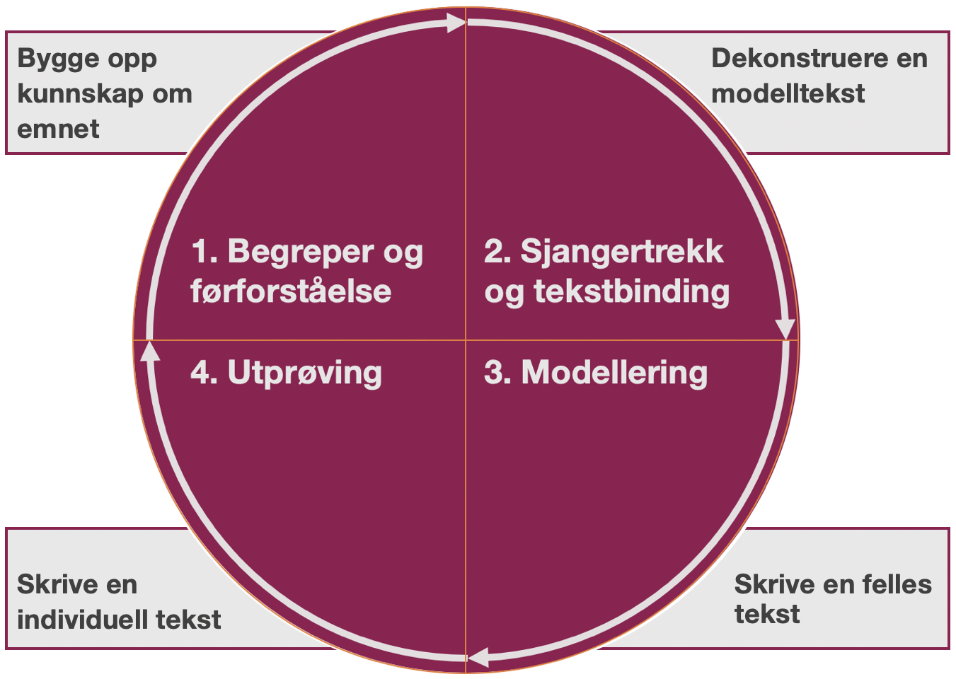 Sirkelen for undervisning og læring er sentral i sjangerpedagogikken. Den beskriver de ulike fasene som brukes i tekstarbeidet. Sirkelmodellen kan symboliseres på ulike måter og ha tre, fire eller fem faser. Her viser vi en modell med fire faser: