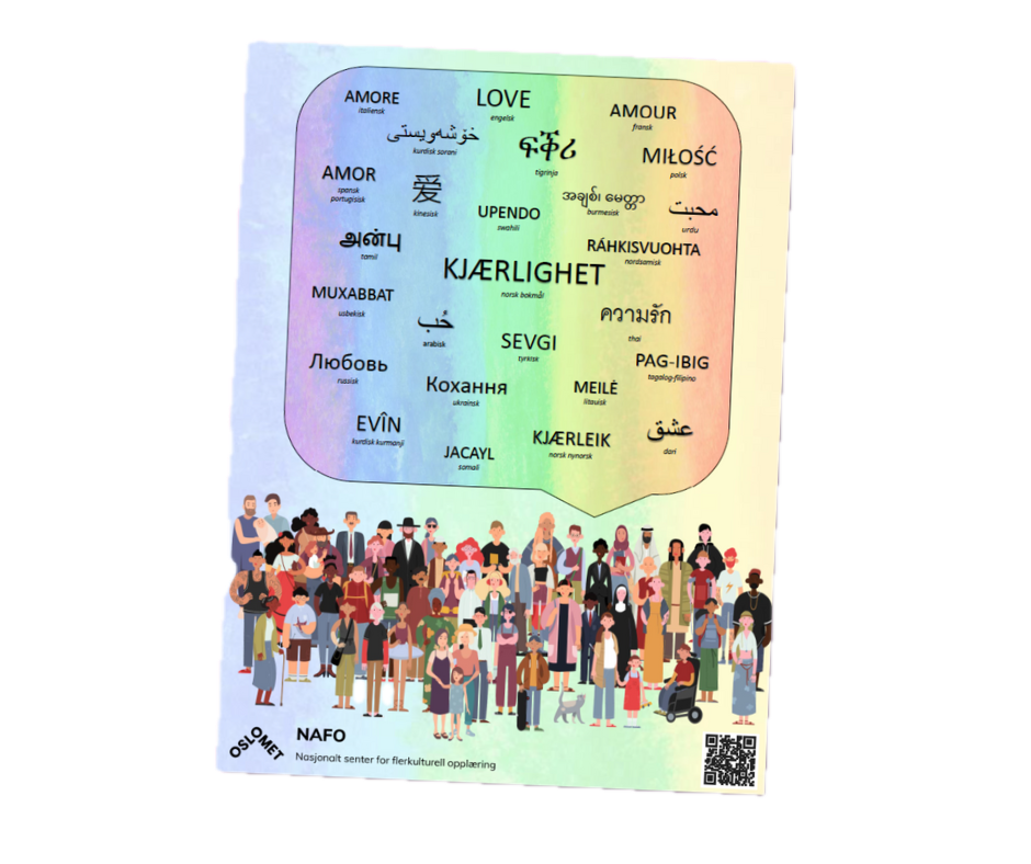 Hos morsmål.no finner man en fargerik plakat med ordet kjærlighet på over 25 språk. Plakaten viser et bredt mangfold av mennesker. Plakaten kan også redigeres hvis man ønsker å legge til flere språk.
