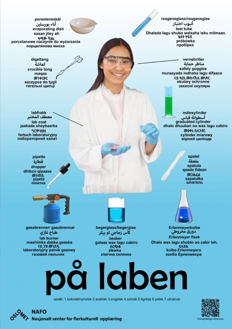 Lab-plakaten viser et utvalg sentralt laboratoriumsutstyr på flere språk. Plakaten er ment å være en støtte i naturfag eller kjemi samtidig som den illustrerer et språklig mangfold. Vi ønsker at elevene skal bruke hele sin språklige kompetanse i opplæringa. Strørrelse A2.