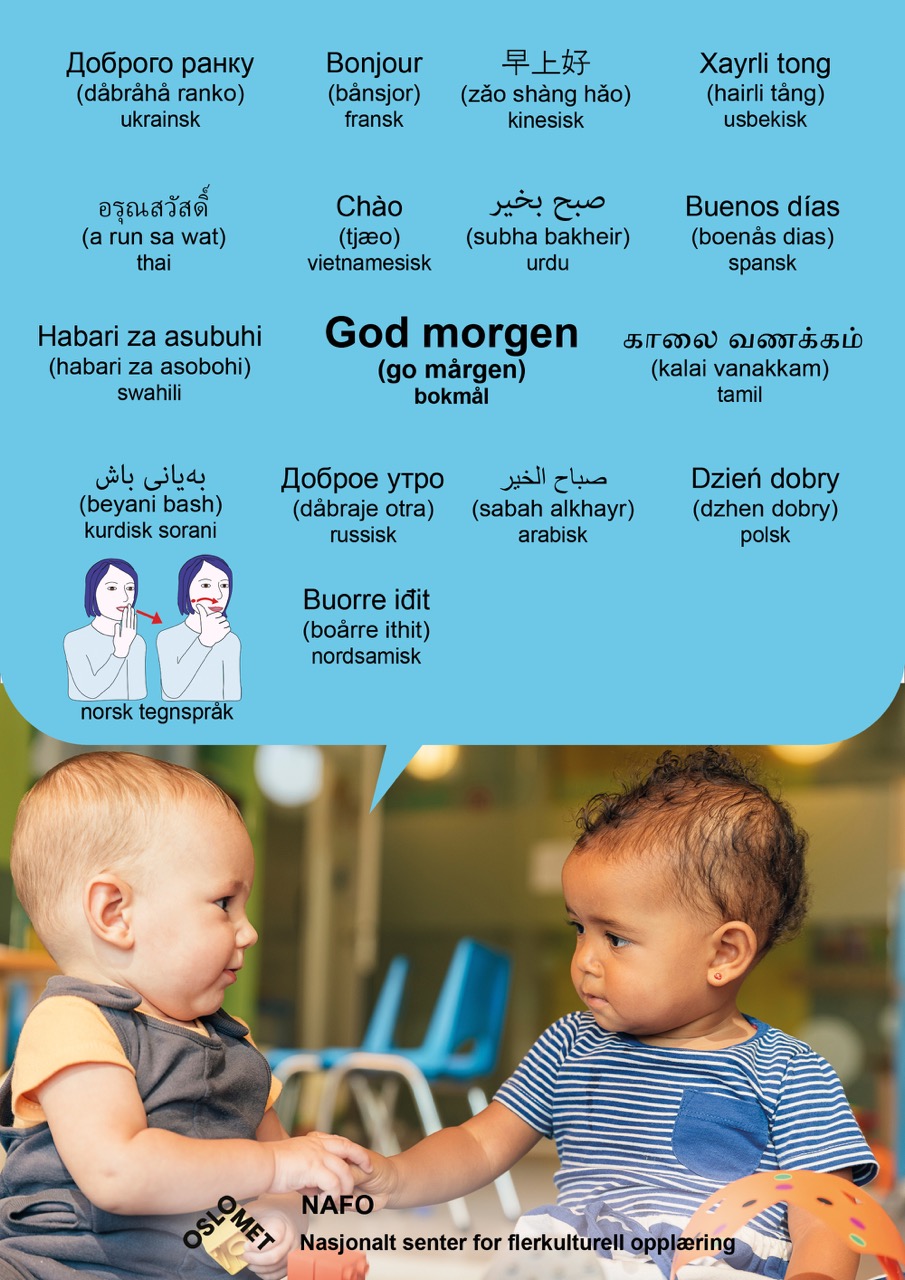 God morgen-plakaten viser ordet God morgen på flere språk. Plakaten er ment å være en dekorativ plakat samtidig som den oppfordrer til å anerkjenne barn, unge og voksnes språklige kompetanse og flerkulturelle bakgrunn. Denne utgaven er særlig egnet i barnehagen. Størrelse A3.