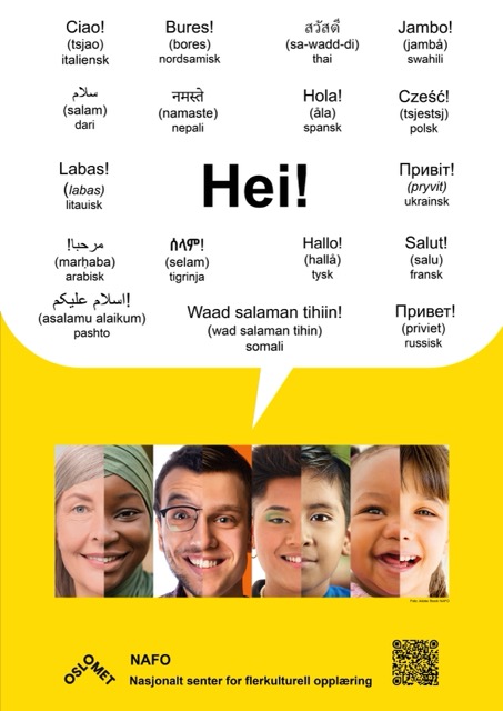 Hei-plakaten viser ordet hei på flere språk. Plakaten er ment å være en dekorativ plakat samtidig som den oppfordrer til å anerkjenne barn, unge og voksnes språklige kompetanse og flerkulturelle bakgrunn. Størrelse A3.