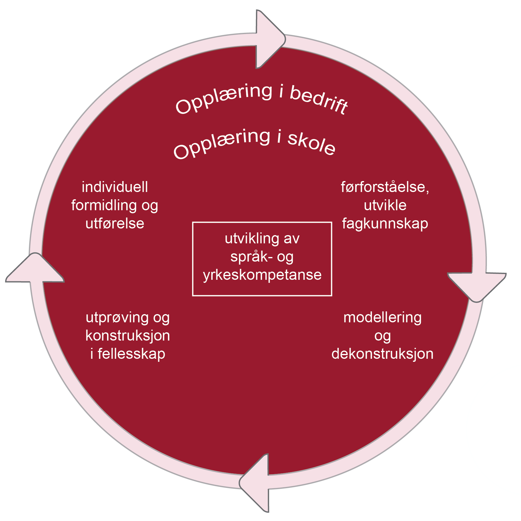 Sirkelen for undervisning og læring viser også med de ulike fasene stegene fra å trenge mye støtte til å bli selvstendig yrkesutøver. Alle trenger støtte når de starter et utdanningsløp. Nyankomne elever, trenger støtte språklig, til å forstå kontekst og til å overføre læring fra en opplæringsarena til en annen. Modellen viser at opplæringen skjer både i bedrift og på skolen. Målet for opplæringen er fagprøven. Alle som inngår i laget rundt eleven må ha sluttmålet for øyet.