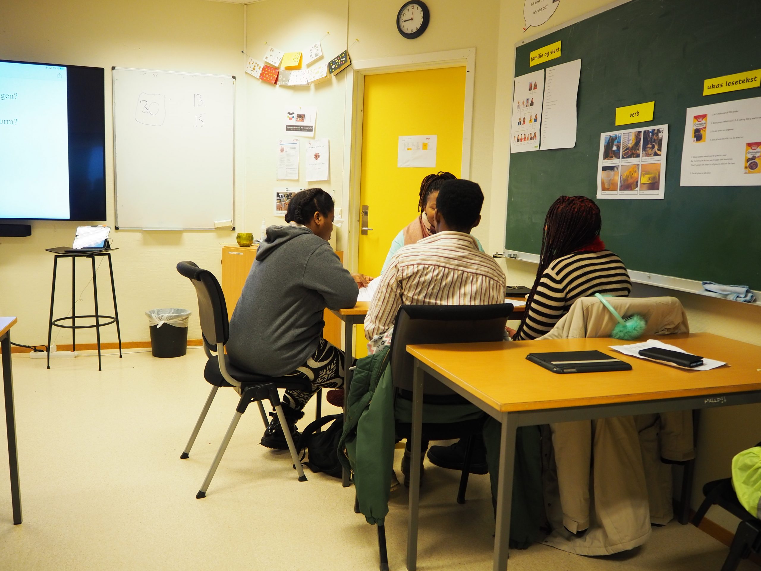 I klasserommet på Karmøy har deltakerne bakt kake og tatt bilder av prosessen. Nå skal de skrive en beskrivende tekst om kakebakingen. De sitter gjerne i språkgrupper og har en flerspråklig assistent tilgjengelig mens de skriver sin egen tekst på norsk. Når de er plassert i språkgruppe er det lett å be andre deltakere eller den flerspråklige assistenten om hjelp.