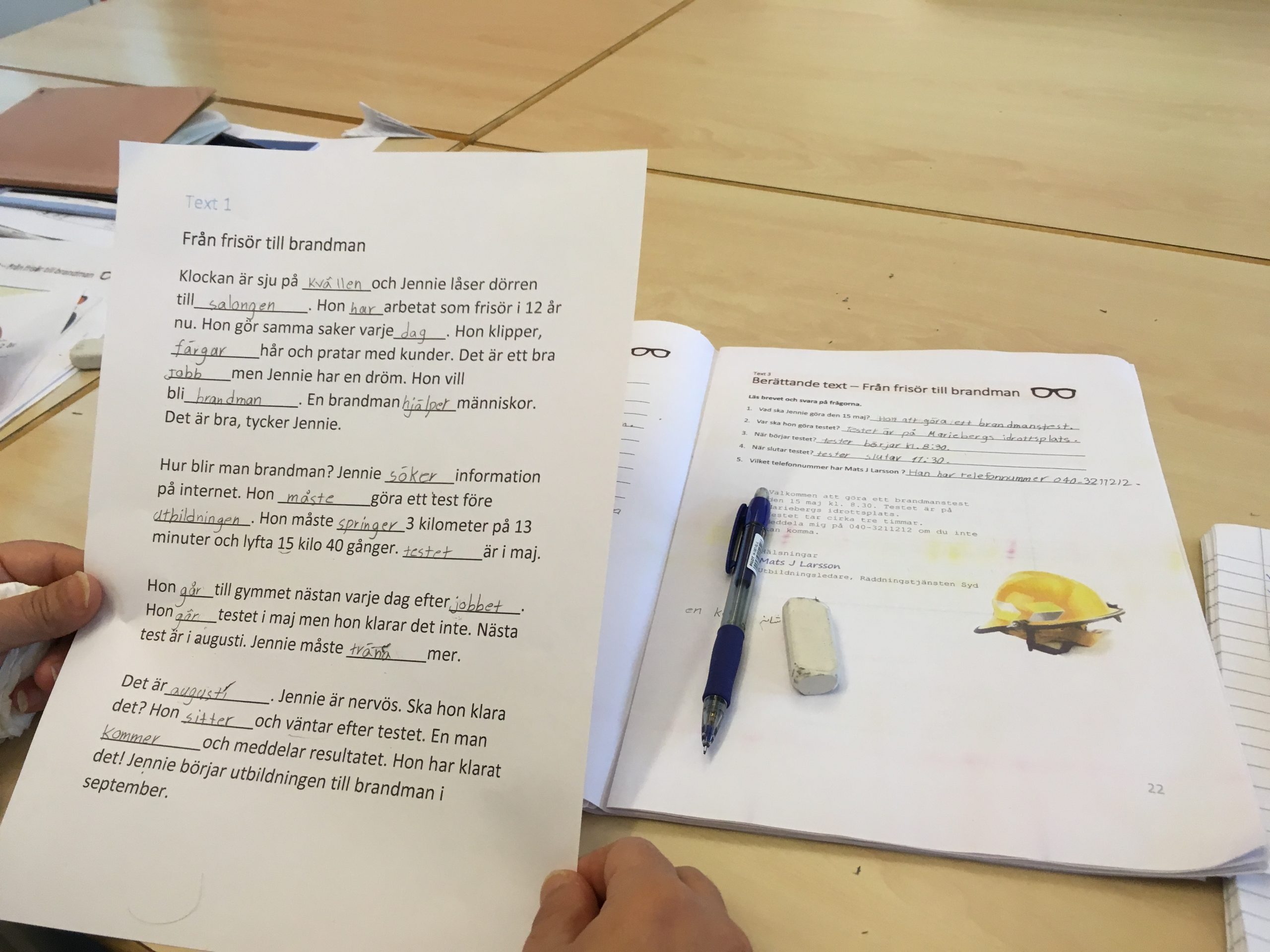 Elevene i voksenopplæringen i Oslo har fagdag sammen med faglærer i helsefag og norsklærer. På forhånd har norsklæreren valgt ut noen begreper fra teksten det skal jobbes med. Læreren har klippet begrepet og den forklarende teksten fra hverandre. Når deltakerne får rett begrep på plass ved setningen, får de modellert hvordan uttrykket kan inngå i en faglig sammenheng.